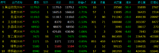 2026年2月10日,国内期货主力合约涨跌不一。沪锡、烧碱涨超3%,豆一、沪银、SC原油、燃料油涨超2%,低硫燃料油(LU)、PTA涨超1%;跌幅方面,集运欧线跌超4%,焦煤、焦炭、工业硅、多晶硅、苯乙烯(EB)跌超1%。