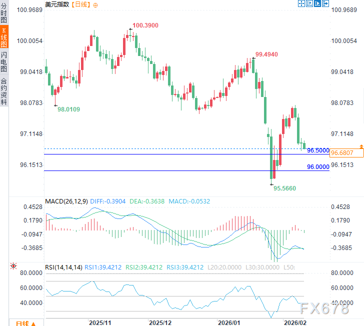 (美元兑日元日线图,来源:易汇通)周三亚市时段,美元指数小幅走低,这已是连续第四个交易日走低,现交投于96.65附近,日内跌幅约0.2%。美元指数现已抹去了2月份的涨幅,将在显著低于中线水平的RSI下测试一个强劲的支撑区间(96.00至96.50)。