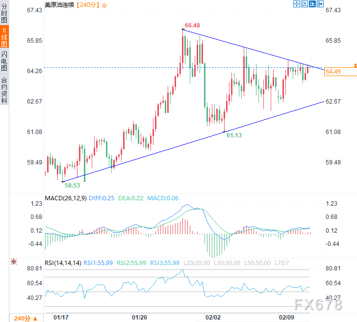 一个大型牛市旗形似乎正在形成,但将取决于伊朗局势的发展。周三亚市时段,美原油价格震荡走强,现交投于每桶64.50美元附近,日内涨幅约0.85%。