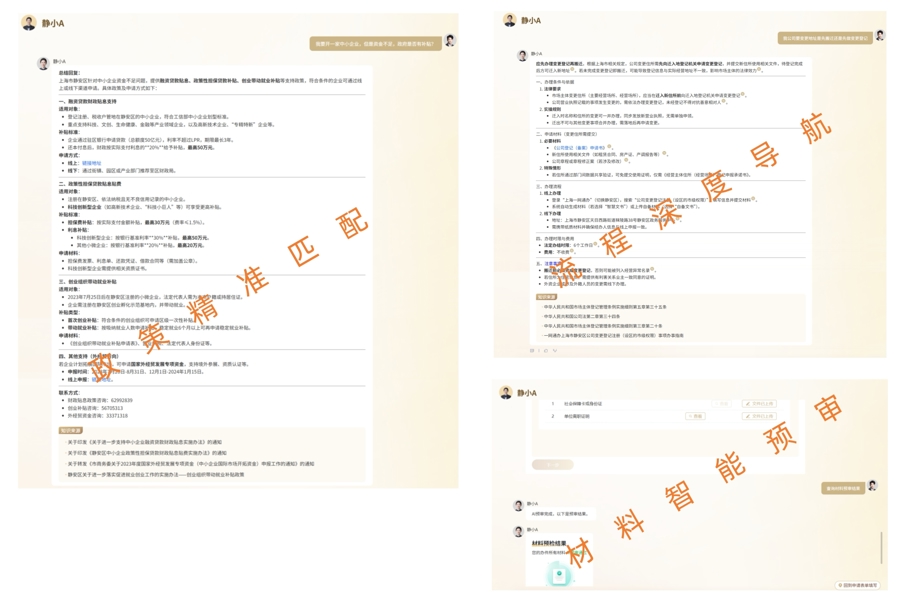 她可以进行材料智能预审,企业上传申报材料后,“静小A”可进行初步的规范性、完整性检查,大幅降低因格式错误、内容缺失导致的反复提交,提升一次通过率。